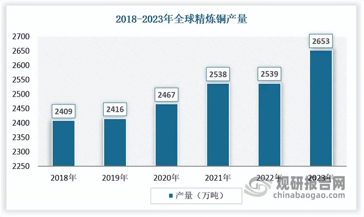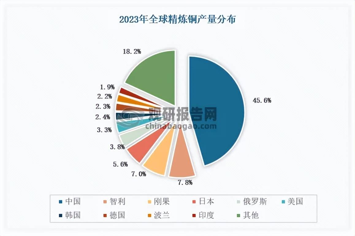 从产量来看,全球精辟铜的产量正在过去几年中呈现增加趋向。按照国际铜业研究组织(ICSG)、USGS数据,2023年全球精辟铜产能2949。6 万吨,同比增加2。7%;全球精辟铜产量2653万吨,同比增加4。49%,增幅扩大。正在产量别离上,中国是全球最大的精辟铜出产国,2023 年产量占全球的 45。6%,较 2022 年提高 3 个百分点。其他精辟铜次要出产国还有智利、刚果(金)、日本、俄罗斯等,此中,刚果(金)精辟铜产量增加较快,跨越日本跃居全球第三位;前十国合计产量占全球产量的 81。9%,集中度进一步提高。