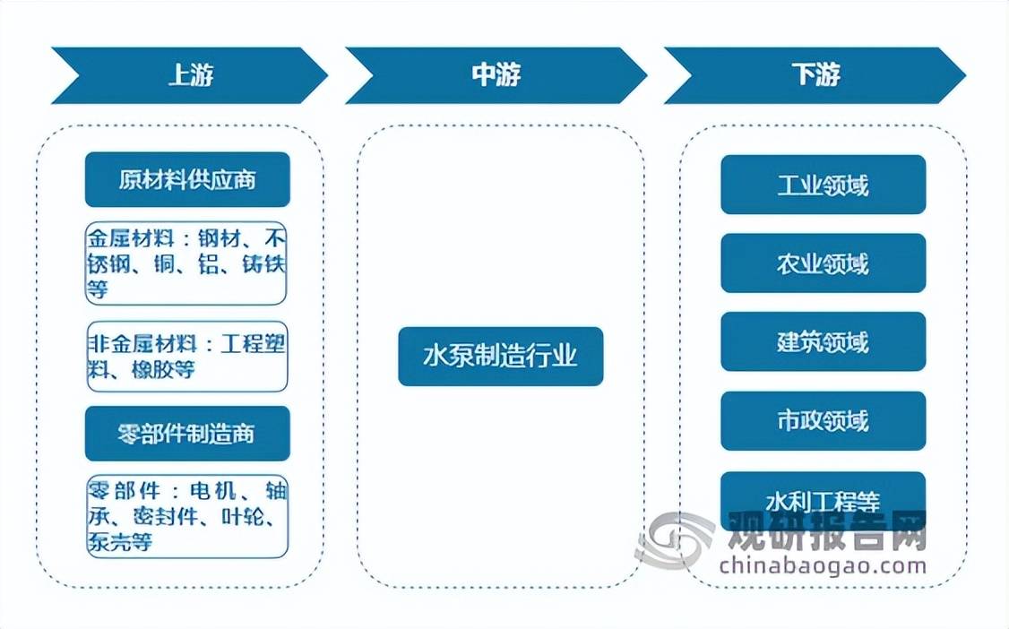 水泵财产链布局较为清晰,上逛为水泵原材料及零部件等,次要由钢材、铝材、铜、机械配件等;财产中逛为水泵出产制制;下逛使用范畴为工业、农业、建建、市政等范畴。