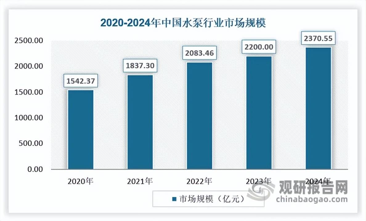 水泵行业是我国通用机械制制业的主要构成部门,正在国平易近经济扶植中起着十分主要的感化。为了顺应我国度庭供排水、农林灌溉、工业、市政、国防军工等行业的成长,我国水泵制制业企业以市场需求为导向,以严沉手艺配备成套为方针,通过自从立异和引进消化接收再立异等行动,取得了一系列沉点产物的研究,根基满脚了国平易近经济各部分对产物的需求,构成了较完整的制制系统,无力地推进了我国石化、电力、冶金等范畴严沉配备国产化。2023年我国泵行业市场规模为2200亿元,2024年达到12370。55亿元。