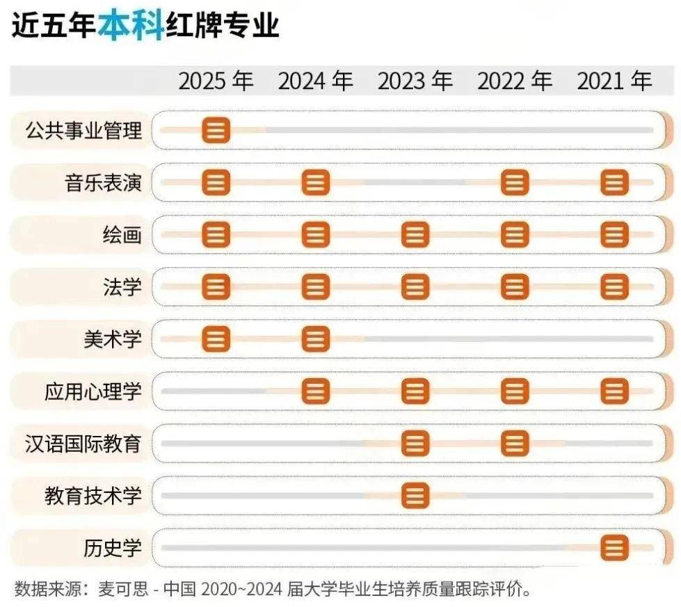 红牌专业指市场饱和、人才过剩、薪资和就业对劲度偏低的专业,2025年包罗公共事业办理、音乐表演、绘画、、美术学。