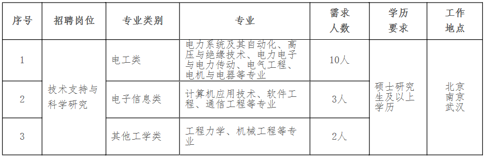 按照用工需求,2017年院本部(工做地正在)聘请电力系统及其从动化、会计学、金融办理、计较机手艺等专业的硕士研究生及以上学历应届结业生。因进京打算需上级单元和国度相关部分审定后方可确定,各岗亭具体需求人数另行发布。专业范畴:计较机科学取手艺、消息平安、财政金融、财政办理、电气工程及其从动化、安全、投资学等相关专业。工做地址:公司总部及分支机构。对录用人员按照公司需要和本人志愿确定工做地址,签定正式劳动合同。