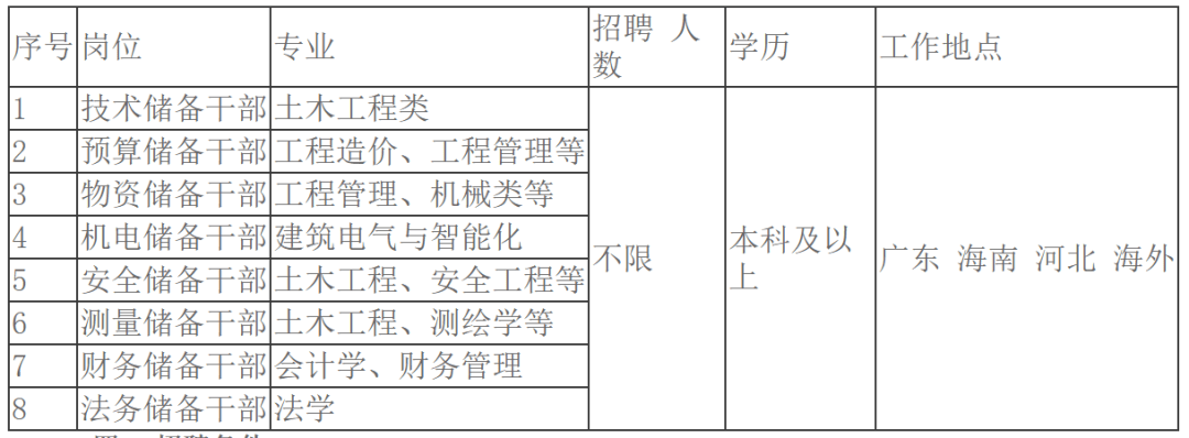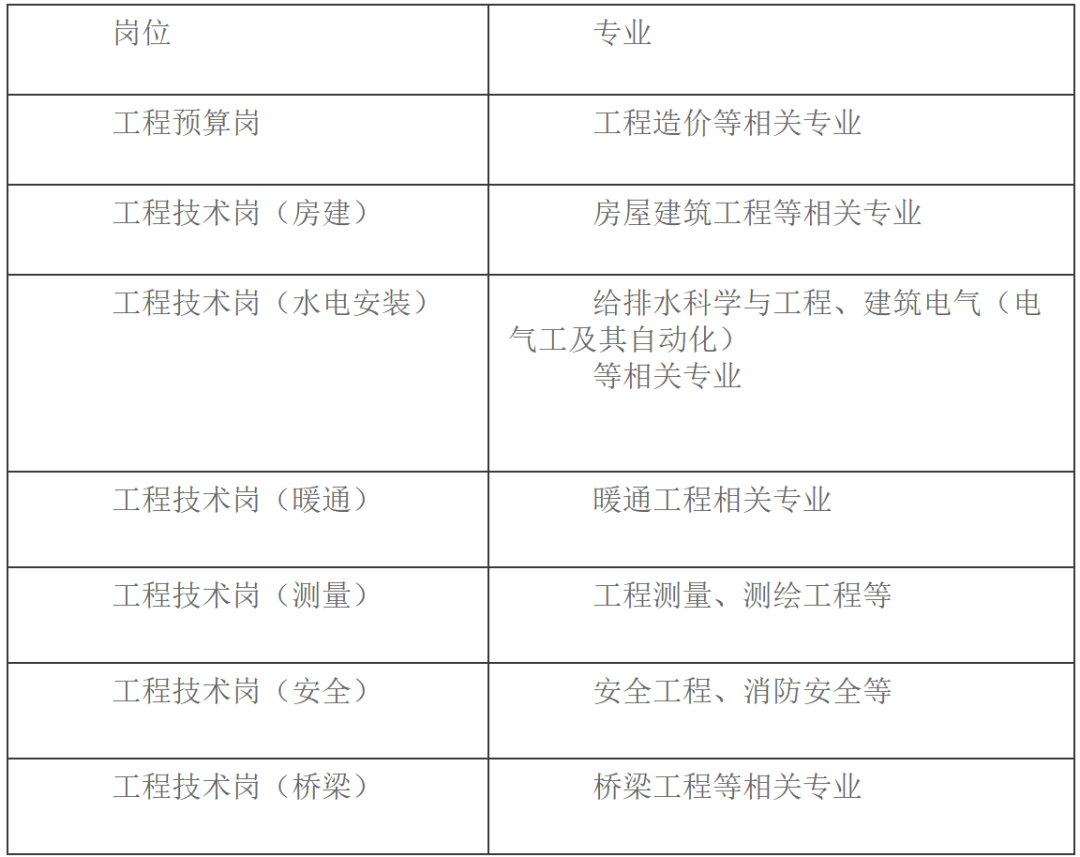 1。工程手艺岗:土木匠程、智能建制、岩土工程、铁道工程、桥梁取地道工程、交通工程、市政工程、给排水工程、工程办理(制价)、建建学、线规划、坐场设想、地质工程、建建取设备工程、平安工程、无机非金属材料、物流运输、交通运输(铁标的目的)、机械工程、机械设备及其从动化、测绘工程、摄影丈量取遥感、BIM手艺及使用、电气工程及其从动化、轨道交通信号取节制、暖通工程、通风及空调工程、矿业工程等相关专业 5 人。